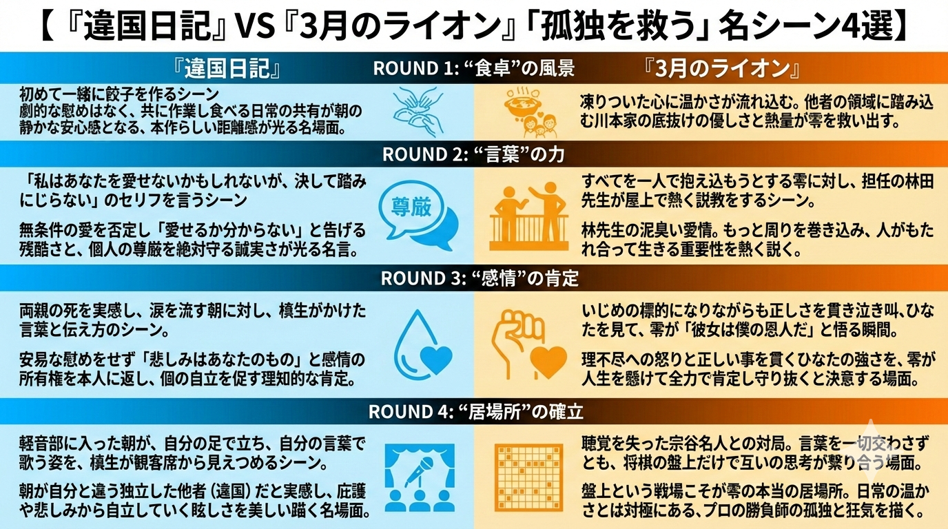 ヤマシタトモコの『違国日記』は完結した今(全11巻)、静かに「名作」と呼べる域に達してる。孤独・理解し合えなさ・不器用な愛・言葉の限界。静かに沁みる、いや染み込んでくる。刺さる人には一生モノになるタイプ。どっちも「心の機微」「孤独と癒し」「不器用な人間関係」を描く点で共通してる。ただ『3月のライオン』は深さと広がりが違うと思う。将棋+重い喪失・鬱・家族・成長・人間関係の多層性。人生のバイブル級。さらに詩的で心に刺さる名言多数。感情のレイヤーが厚い。